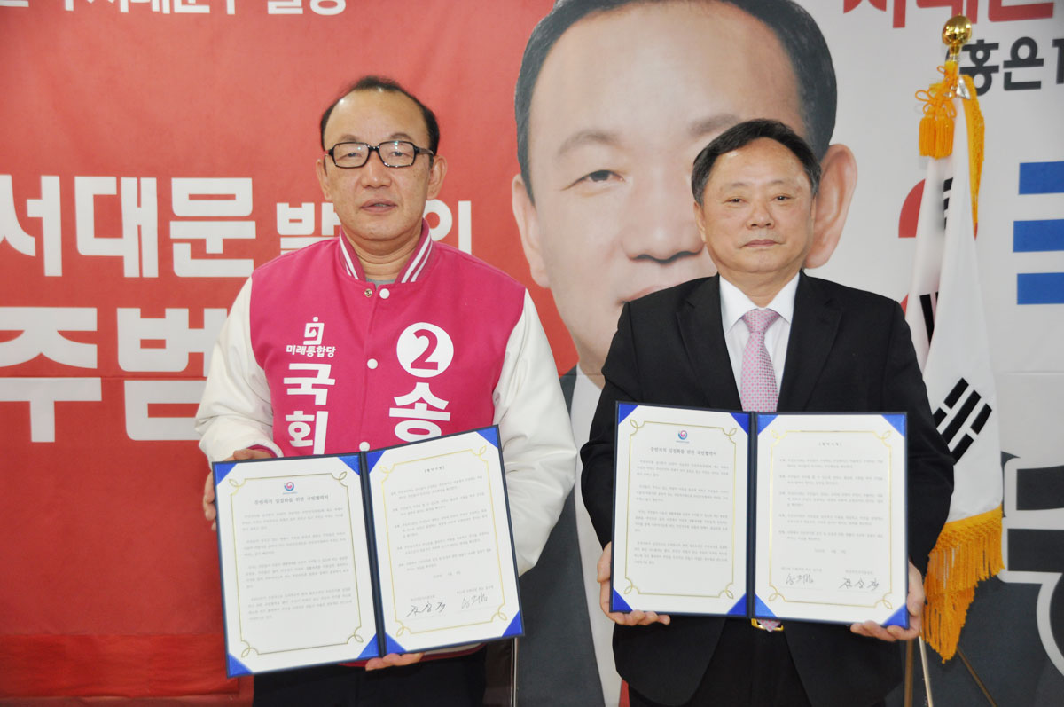 송 후보는 9일 서대문구 남가좌동 자신의 선거사무소에서 한국주민자치중앙회(대표회장 전상직)와 '주민자치 실질화를 위한 국민 협약'을 체결했다.